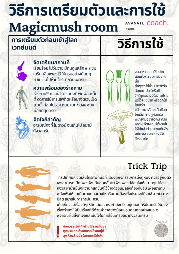 - ความเสี่ยงสำหรับผู้ที่ใช้เห็ดวิเศษ คือ การมีประสบการณ์ที่ไม่ดี หรือ “bad trip” (อาการกลัวภาพหลอน) บางคนอาจรู้สึกบอบช้ำจากประสบการณ์นี้และรู้สึกกลัวและวิตกกังวลมาก ในบางสถานการณ์ ผู้คนอาจเกิดอาการปั่นป่วนและสูญเสียการควบคุมตนเอง ซึ่งอาจนำไปสู่การบาดเจ็บสาหัสได้