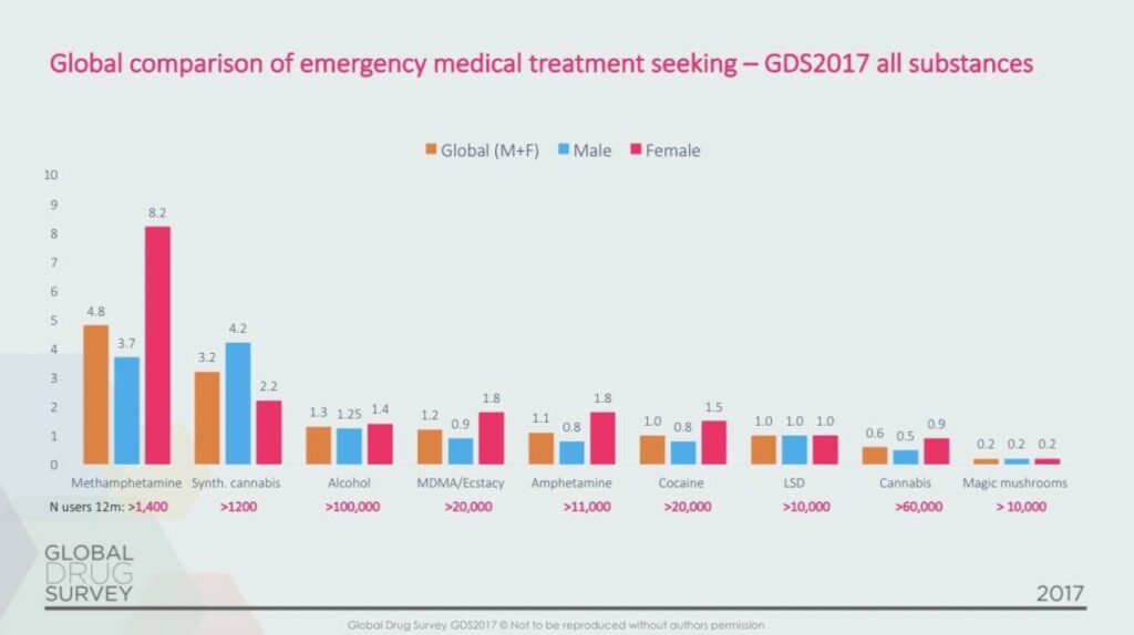 จากสถิติผู้ใช้ Magic Mushrooms พบว่าอัตราการเข้าห้องฉุกเฉินอยู่ที่ 0.2 จากร้อยละ 10 ซึ่งน้อยที่สุดกว่าสารประเภทอื่นๆ